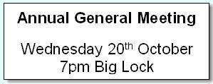 Annual General Meeting. The AGM will be on Wednesday 20th October at 7pm at the Big Lock public house. This meeting only takes about 45 minutes. All members welcome.