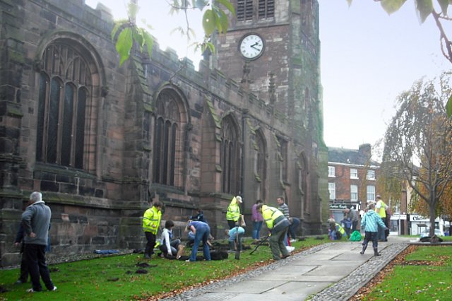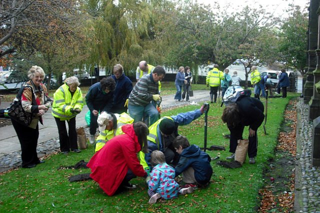 The 7th Middlewich Community bulb planting took place on 25th October 2009. It was a huge success, thirty people came along to help plant thousands of crocus in St. Michael's Church grounds and then had well earned refreshments at the Boars Head. It was a lovely occasion and the results of our hard work will be a splendid display for all our community to enjoy in the spring. Photos: Bill Wlamsley.