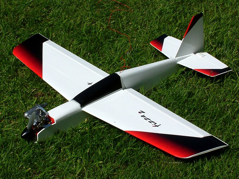 This is my second Fizza built from a magazine plan. It's intended for electric power but mine has an extended nose to house a little Enya09 glow engine.The whole aeroplane has been spayed with fuel proofer which hardened the balsa then a light spraying of white paint went on top. To finish it off I made some water slip decals.